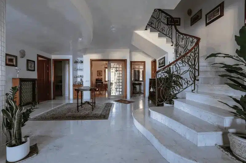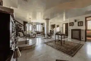 Całkowicie niezależna i otoczona dużym, prywatnym ogrodem, willa rozciąga się na czterech poziomach (ok. 400 m² powierzchni mieszkalnej), połączonych eleganckimi schodami z marmuru karraryjskiego i kutego żelaza oraz wygodną windą.