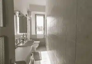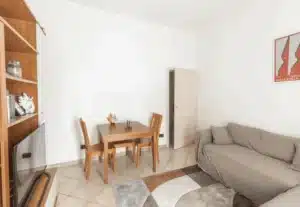 The private area of the apartment includes two bedrooms: the first one is cozy, bright, and designed for two people, while the second is larger and equally well-lit. This space is complemented by a bathroom with a window and a shower. The property also includes a private 14 m² garden, perfect for outdoor relaxation, as well as a 12 m² cellar with access from the shared staircase.