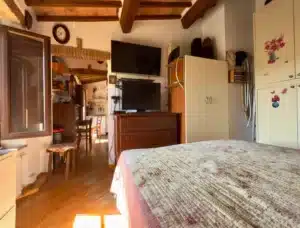 Wchodząc do apartamentu, od razu mamy do dyspozycji przytulny salon z aneksem kuchennym. Jego wnętrze emanuje autentycznym urokiem dzięki odsłoniętym drewnianym belkom stropowym, które podkreślają historyczny charakter nieruchomości, a z okien roztacza się otwarty widok na malownicze dachy Massa Marittima. Kolejno mamy sypialnię główną – komfortową, dobrze rozplanowaną i utrzymaną w rustykalnym stylu, również z zachowanymi belkami, co nadaje jej wyjątkowy charakter. Następnie znajduje się łazienka, wyposażona w prysznic i świetlik dachowy, dzięki któremu wnętrze przez większą część dnia wypełnia naturalne światło. Do apartamentu przynależy również praktyczna piwnica o powierzchni 6 m², usytuowana na parterze budynku – idealne miejsce do przechowywania.