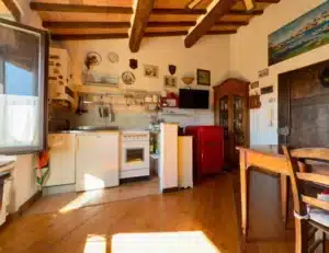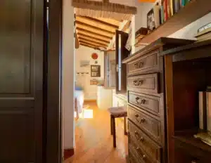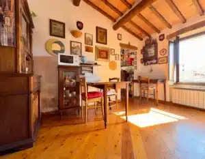 Wchodząc do apartamentu, od razu mamy do dyspozycji przytulny salon z aneksem kuchennym. Jego wnętrze emanuje autentycznym urokiem dzięki odsłoniętym drewnianym belkom stropowym, które podkreślają historyczny charakter nieruchomości, a z okien roztacza się otwarty widok na malownicze dachy Massa Marittima. Kolejno mamy sypialnię główną – komfortową, dobrze rozplanowaną i utrzymaną w rustykalnym stylu, również z zachowanymi belkami, co nadaje jej wyjątkowy charakter. Następnie znajduje się łazienka, wyposażona w prysznic i świetlik dachowy, dzięki któremu wnętrze przez większą część dnia wypełnia naturalne światło. Do apartamentu przynależy również praktyczna piwnica o powierzchni 6 m², usytuowana na parterze budynku – idealne miejsce do przechowywania.